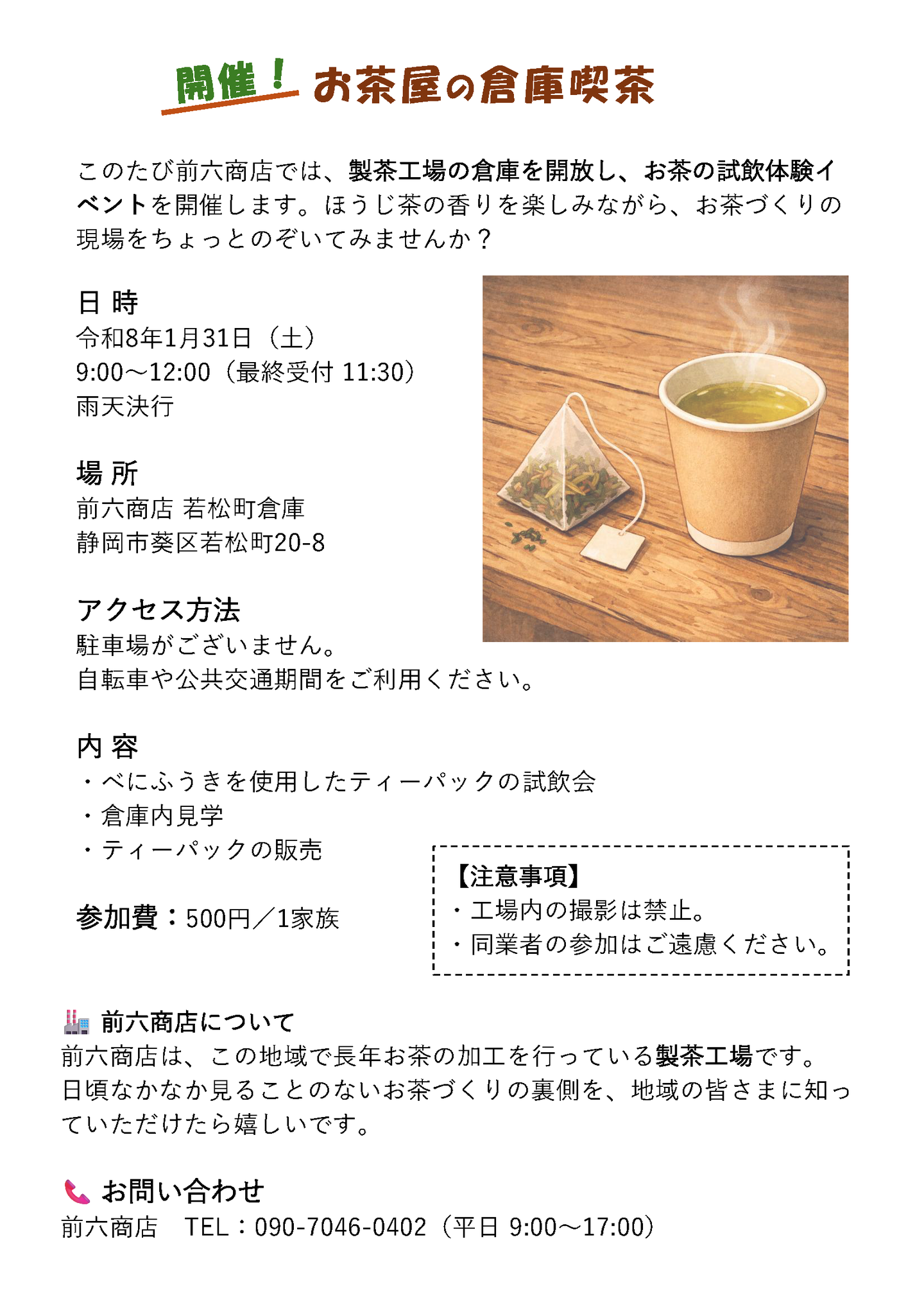 | 2026.01.09 | 2026年1月31日(土)お茶屋の倉庫喫茶を開催いたします。 |