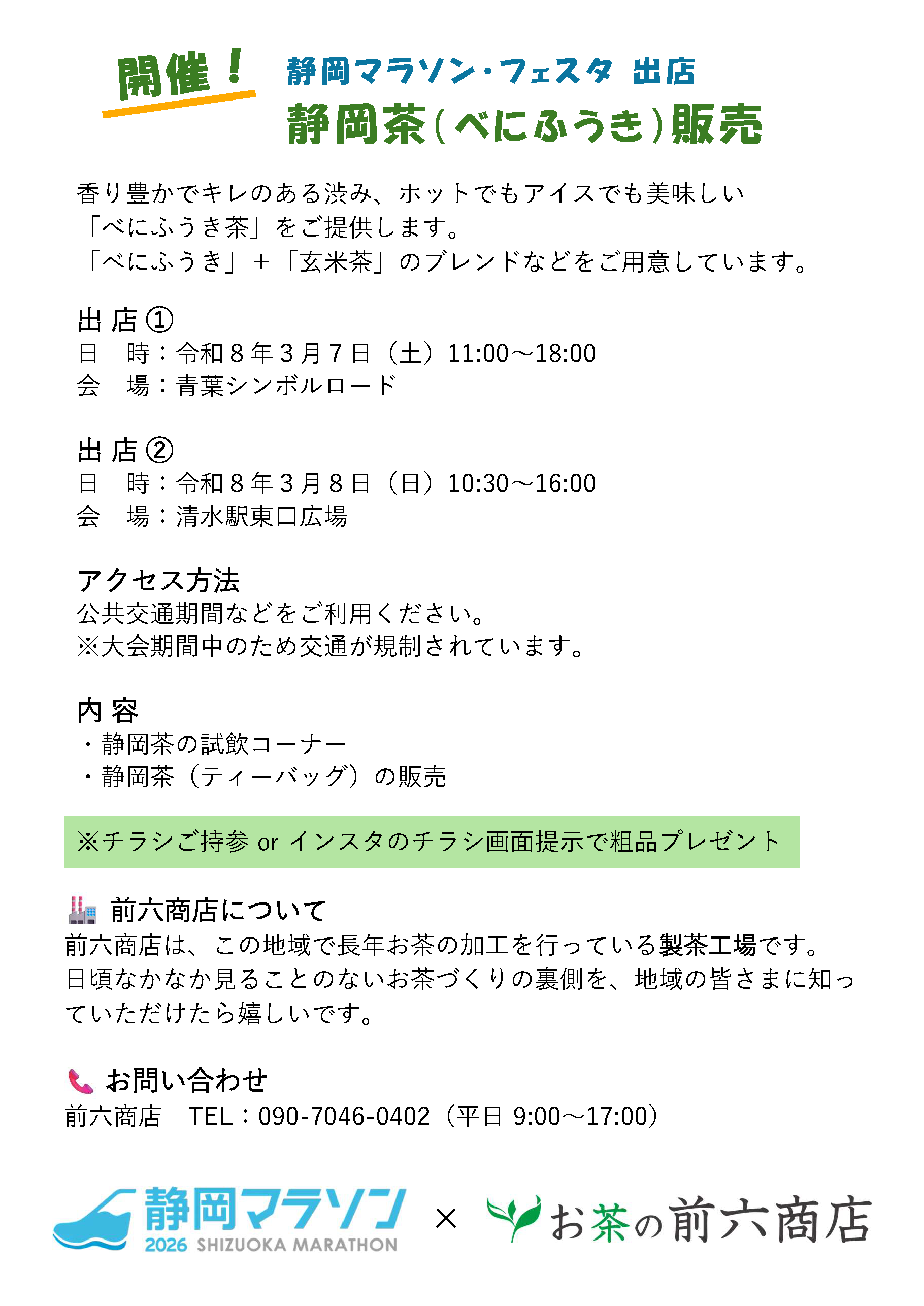 | 2026.02.16 | 2026年3月7日(土)、8日(日)、静岡マラソンフェスタに出店いたします。 |