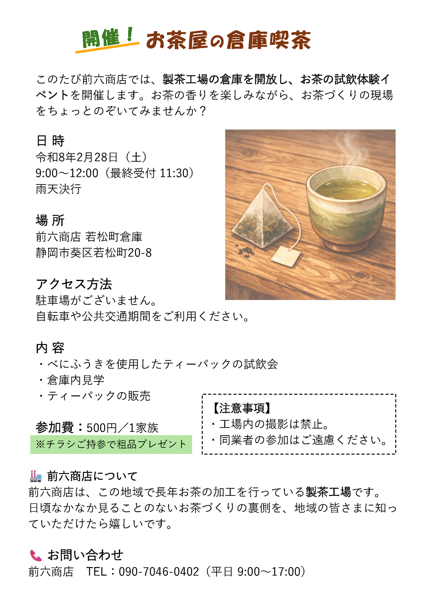 | 2026.02.11 | 2026年2月28日(土)お茶屋の倉庫喫茶を開催いたします。 |
